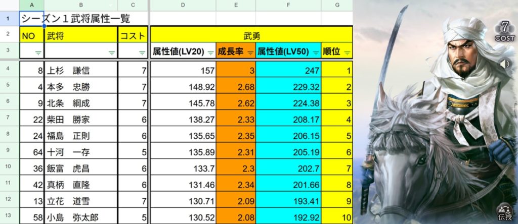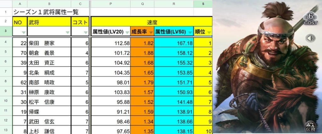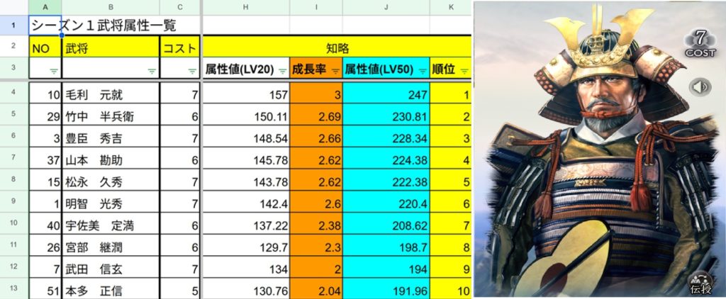 独自で、武将別、属性ランキング表を作ってきましたので、それを見ながら、話題の武将を中心に話をしていきたいと思います。