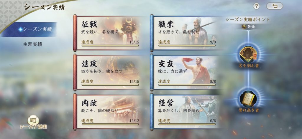 次は画面右上の、シーズン実績ポイントが300に達していると、「①シーズン武将心得」、