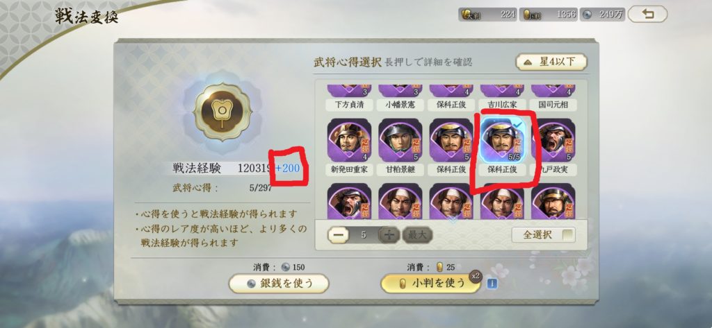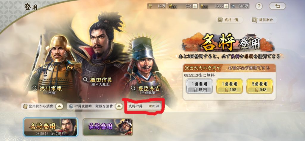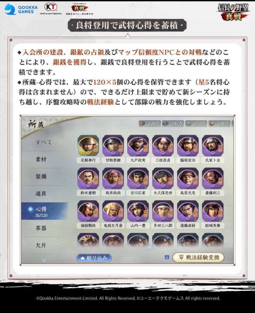 そのため、シーズン1の内に手に入れた銀銭は、良将登用で、武将心得に変換しておく必要があります。