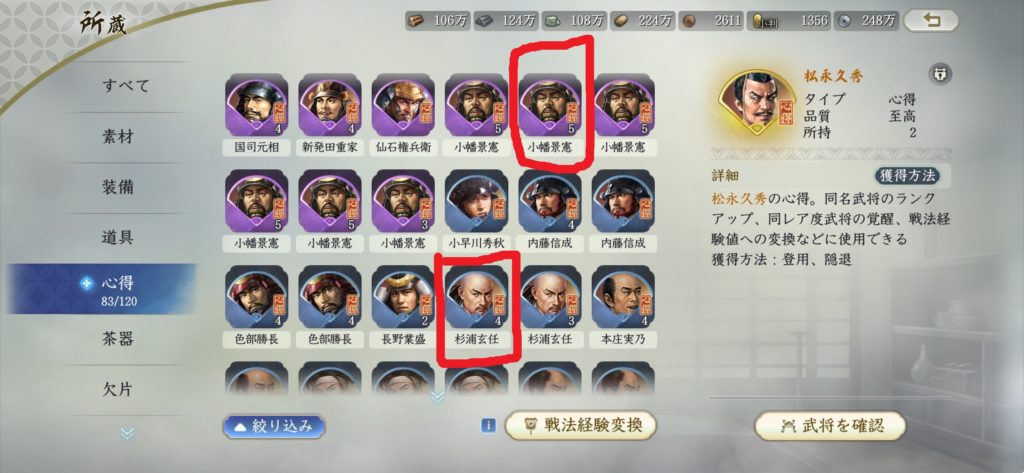 こちらの画面をご覧ください。赤で囲われた部分に、武将心得が最大120枠とあります。