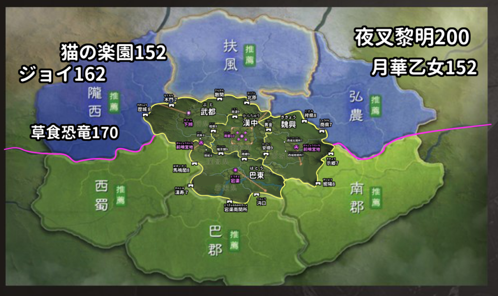 北陣営の配置は、中央をあけて、左に猫の楽園、ジョイ、草食恐竜の3つが固まり、右側が夜叉黎明、月華乙女の2同盟が固まるという配置でスタートしました。