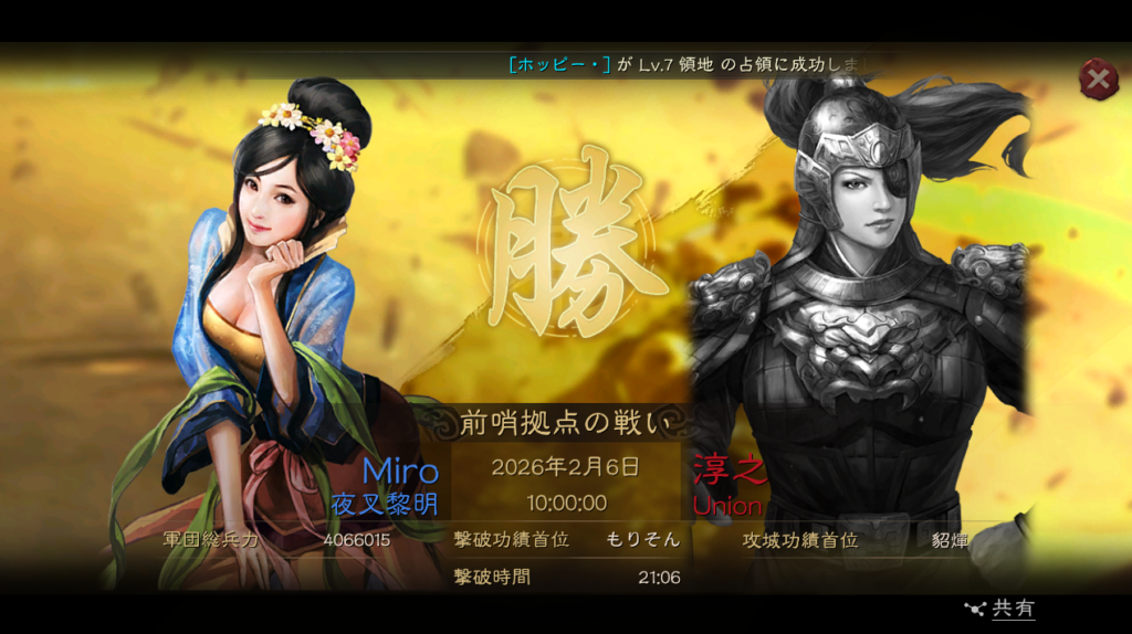 そのままどんどん進み、2月7日の22時にLv9安橋の南東にある砦を取得しました。
