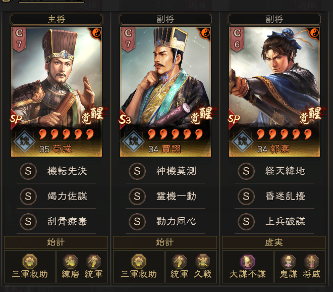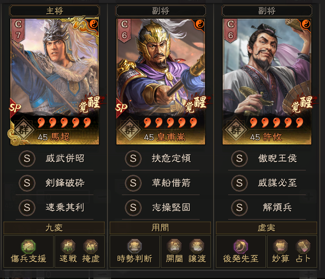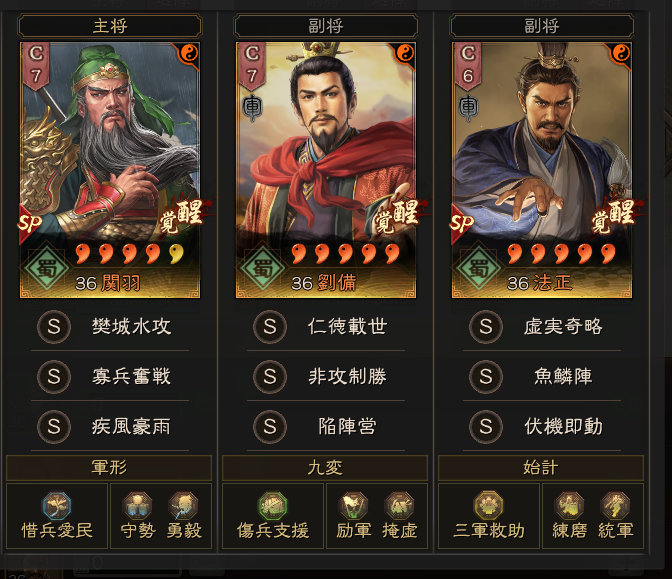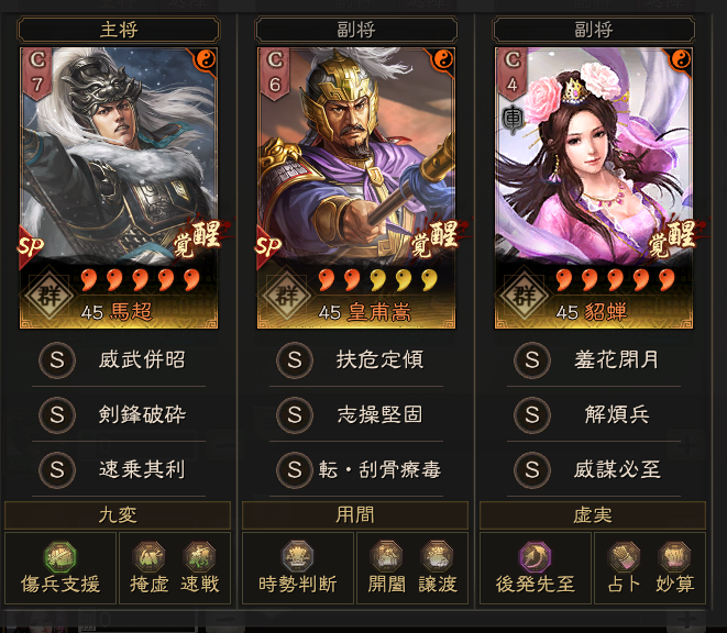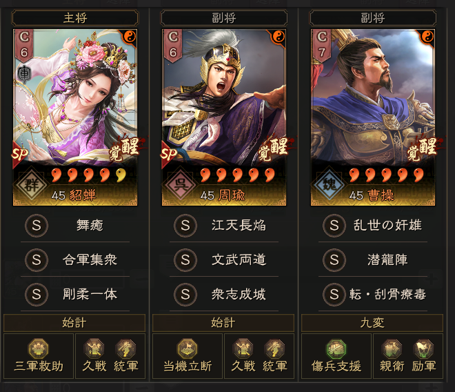 曹操の草船借箭の部分は、転・刮骨療毒にしてあり、今後の上兵破謀を使って富貴騎を作ろうと思っているので、衆志成城にしてあります。