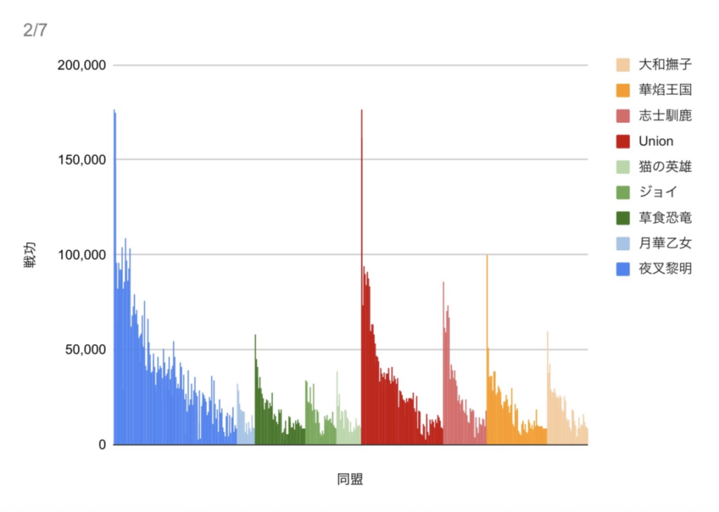 獲得戦功のグラフを見てみると、青色の夜叉黎明と、赤色のUnionが突出して多く、続いて華焔王国、志士馴鹿、草食恐竜といった順番になっていきます。