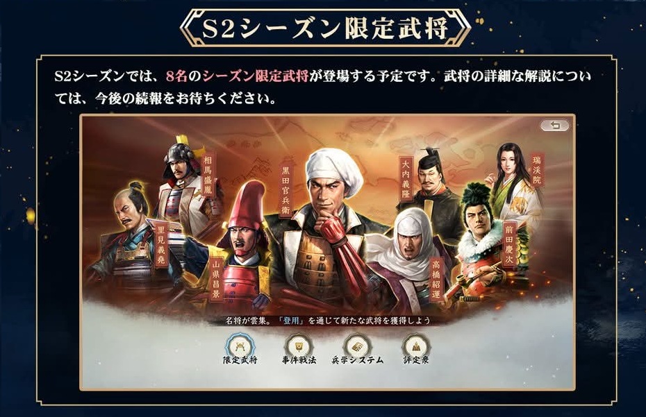 特に、シーズン2に登場する武将は、限定武将になります。