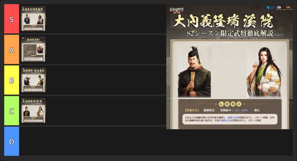 他のシーズン2伝授戦法と比較すると、使い道が限られ、代替戦法の出現が考えられるためBランクにします。