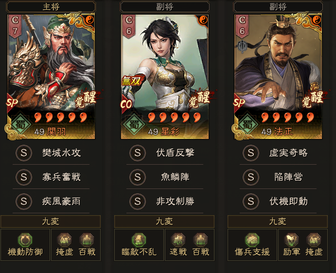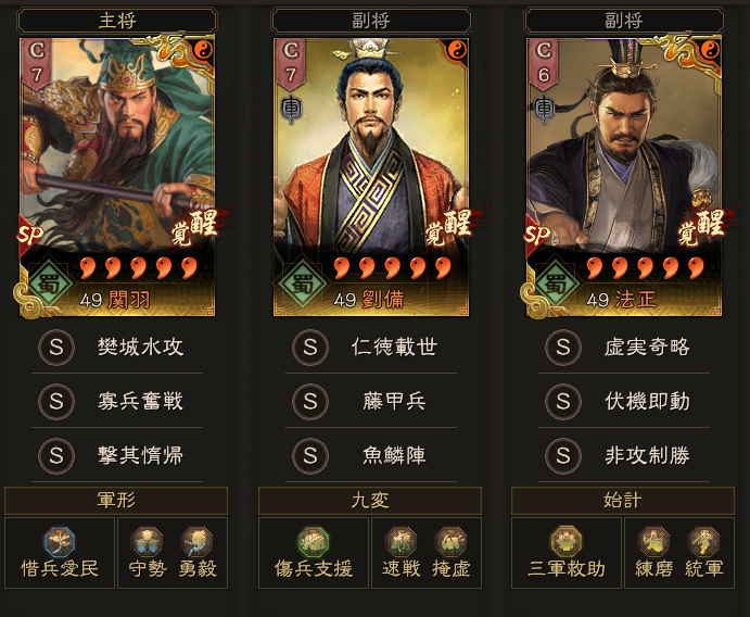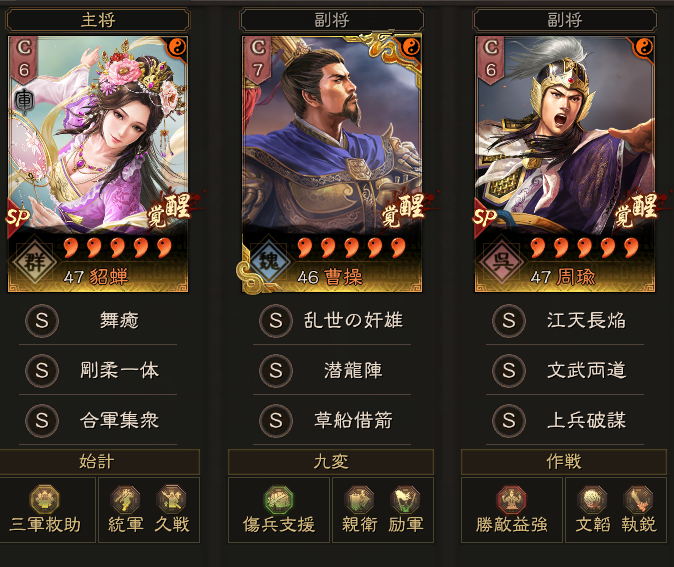 この形が部隊強度的には高いのですが、今期は刮目相待・衆志成城や、刮目相待・剛柔一体で、SP貂蝉に戮力同心を回すなど、色々な共存パターンがあります。
