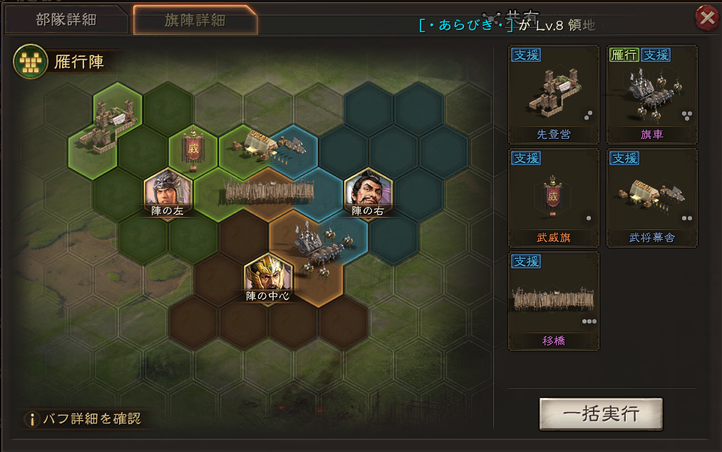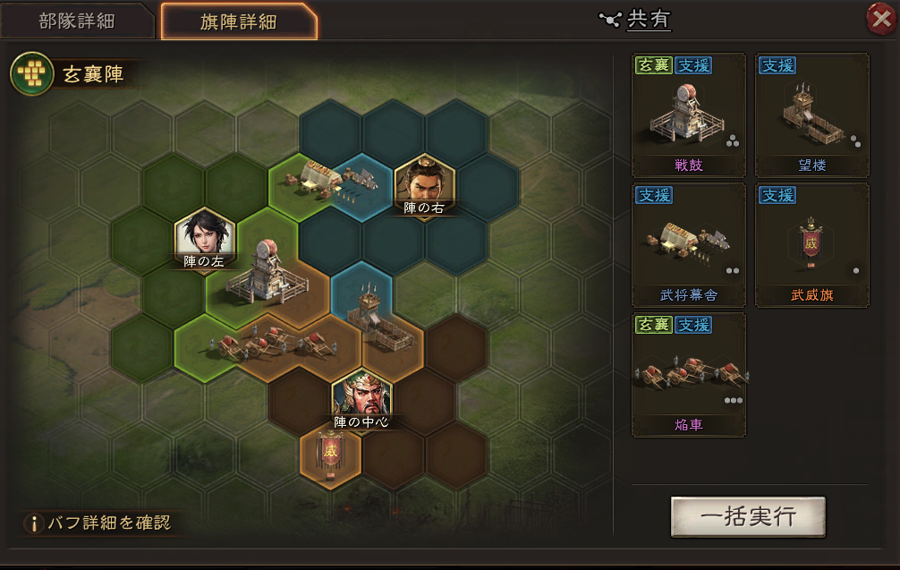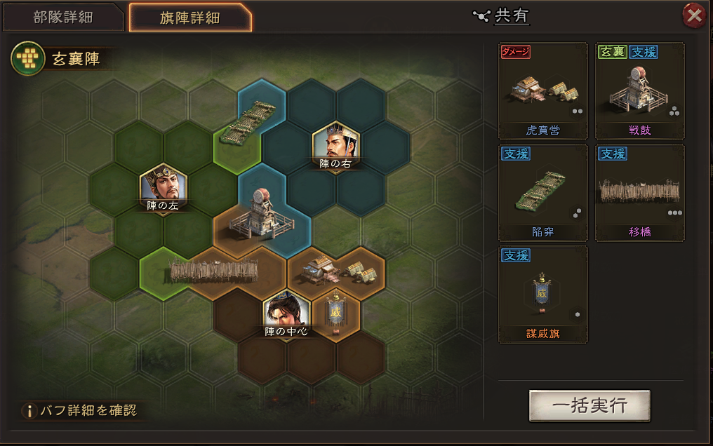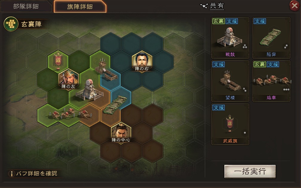 玄襄陣・武威旗・戦鼓・焔車・陥穽・望楼の組み合わせです。