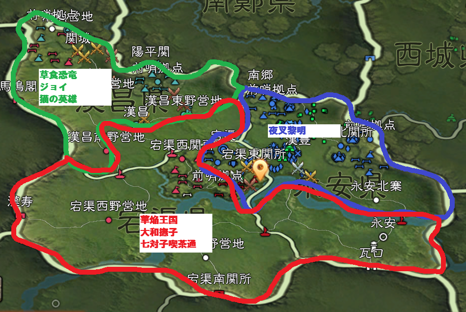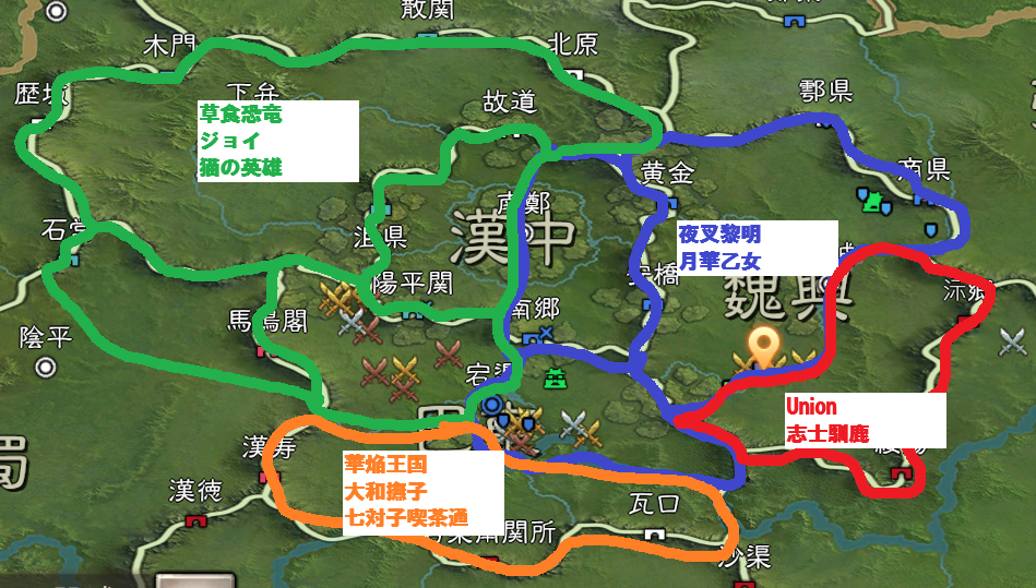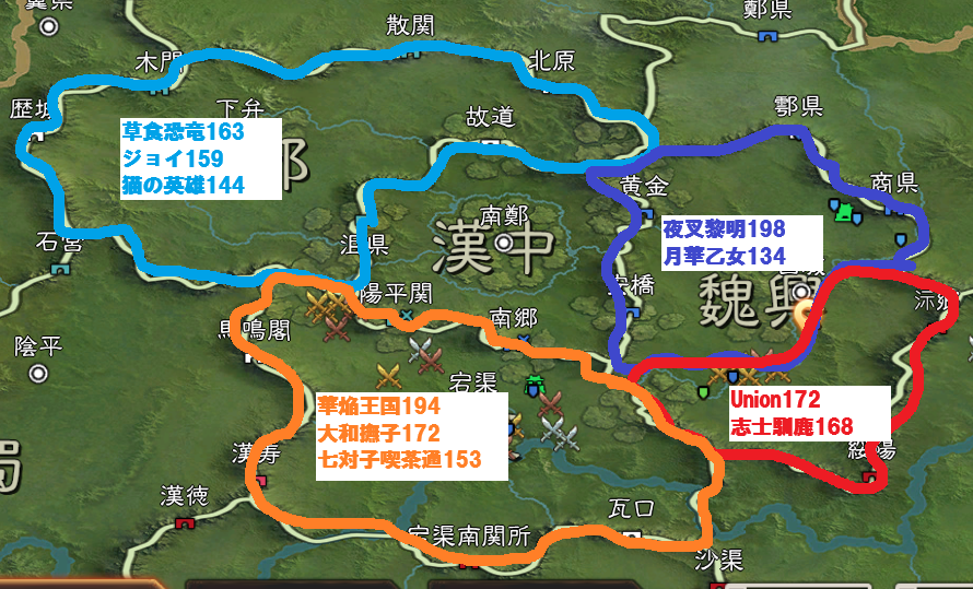 結局、南鄭の周りは、東半分が夜叉黎明、西半分を草食恐竜が取得する形となり、最終決戦の場である、漢中を手中に収めた形となりました。