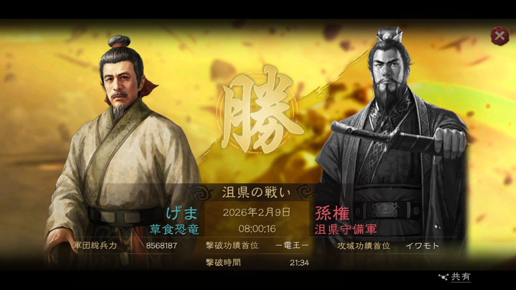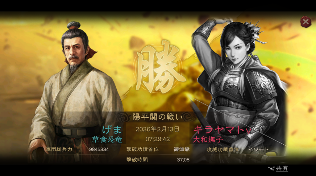 また、南西の関である陽平関は、南陣営の大和撫子が取得していましたが、友軍の総則恐竜が2月13日の7時半に奪取しています。