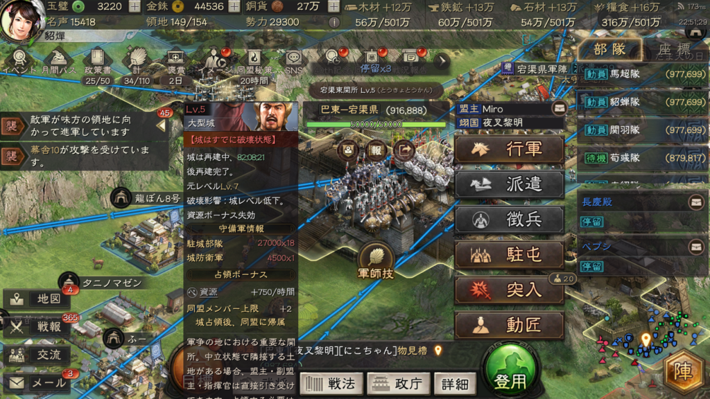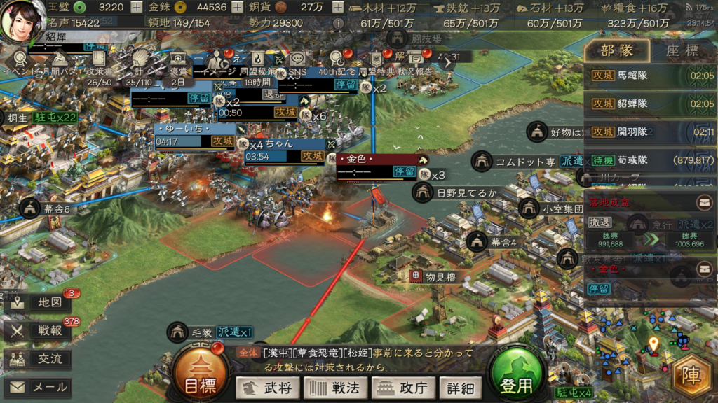 話を戻して、レベル9の関の免戦が解除された、2月9日の8時に各陣営が一斉に攻城をしました。