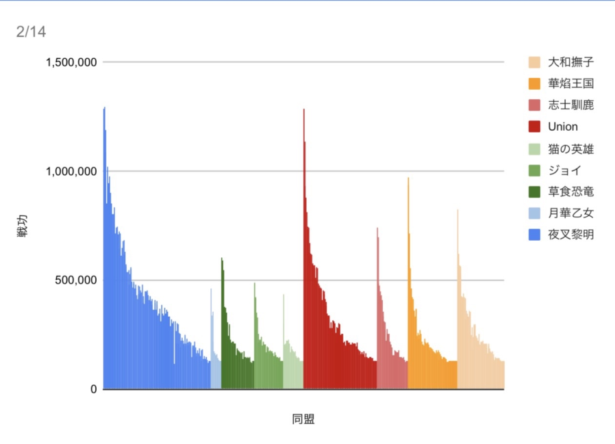 戦功のグラフを見てみると、青色の夜叉黎明が大きいのですが、赤色のUnionも南陣営では突き抜けており、南北の筆頭同盟が、それぞれをリードしているといった状況です。