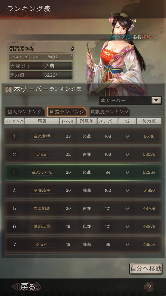 勢力値ベースではこのような感じになっていて、1位が夜叉黎明、2位が対面にいるUnion、3位が夜叉にゃん、4位が友軍の草食恐竜、5位が志士馴鹿、6位が華焔王国、7位がジョイとなっていました。