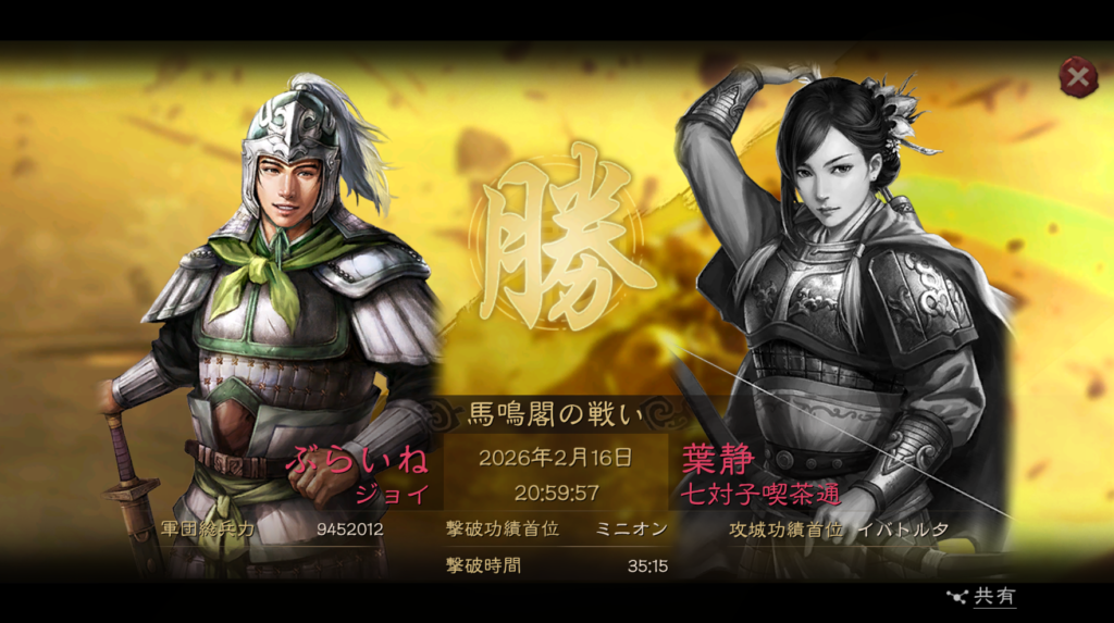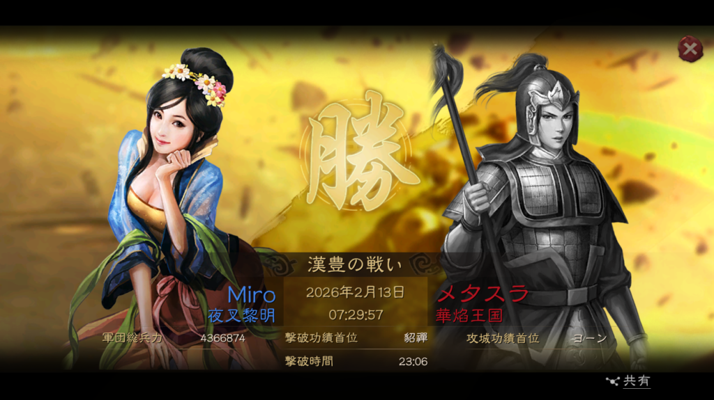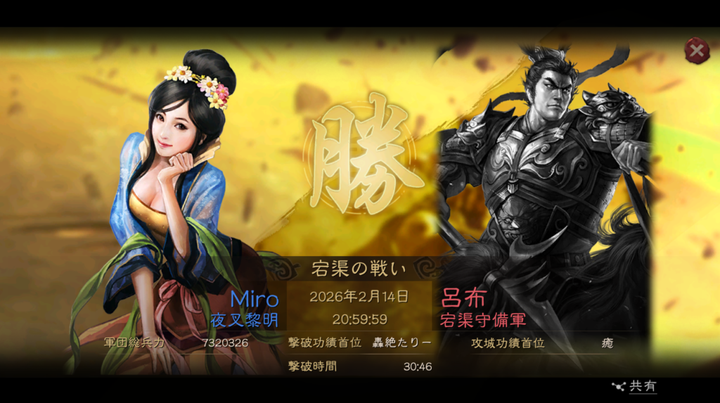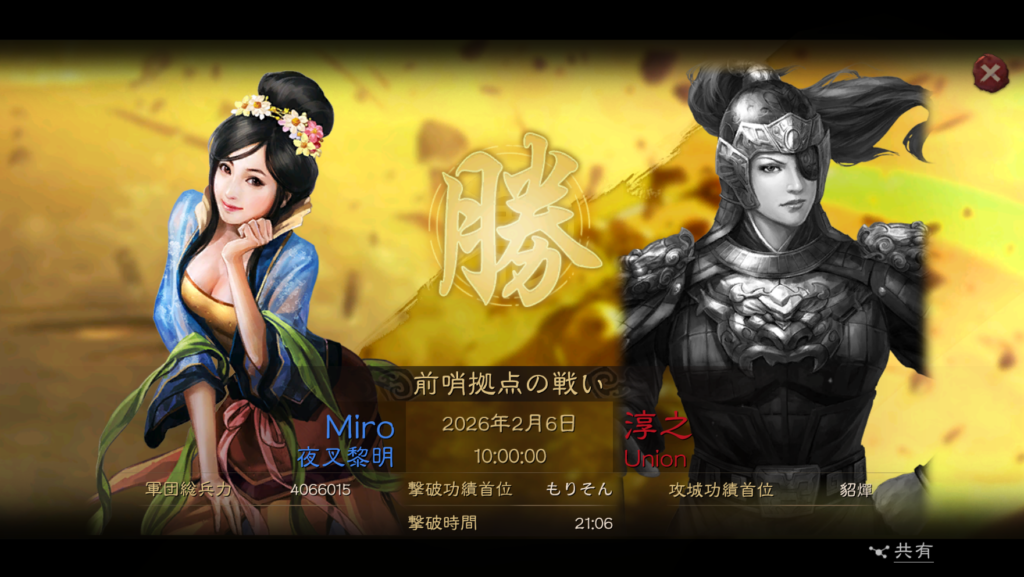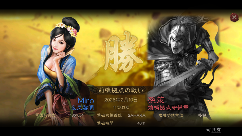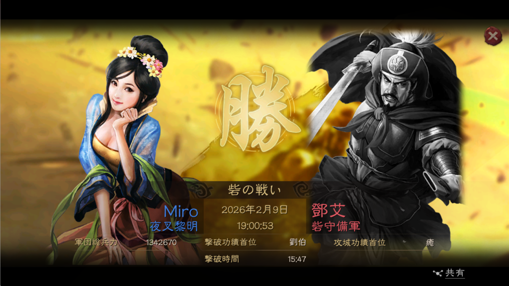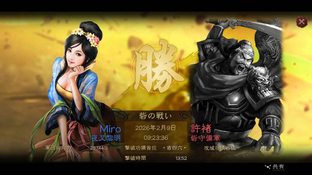そのまま、2月1日の23時に商県の関の攻城に挑戦しましたが、殲滅が足りずに失敗してしまいました。