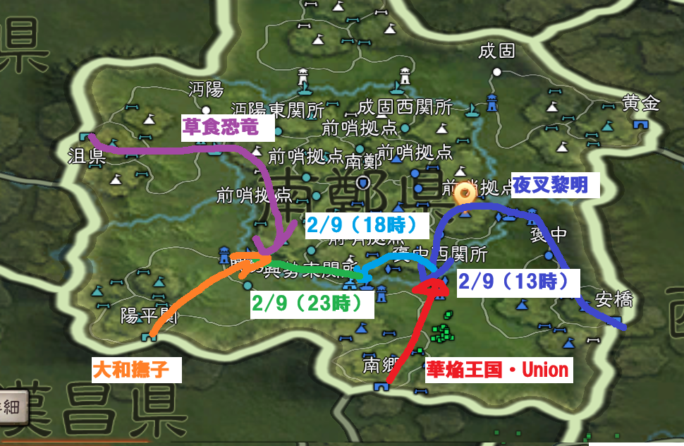 ただ、遠くへ部隊を投げて、その先で士気を回復しながら、南陣営の侵攻を妨害し続け、何とか、西城北関所のすぐ南の前哨拠点を取得できたのが2月5日の19時あたりとなりました。