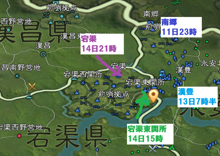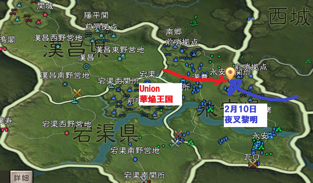 まず、南鄭の埠頭から、南郷へ向かって、零番隊が進軍し、南郷の北側の隣接を目指します。