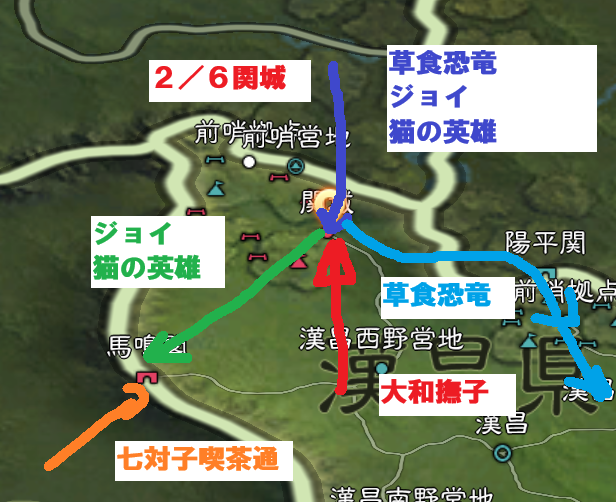 合わせて、同日同時刻に、草食恐竜が陽平関の攻城を行い、これも成功しました。