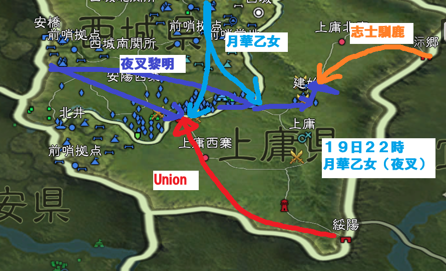 また、東の埠頭を月華乙女・夜叉黎明で突破した先では、上庸があり、そこを19日の22時に合同攻城で落としきることに成功し、終戦前にかなり押し込んだ形となりました。