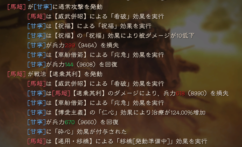 この編成の特徴は、甘寧が草船借箭により、応急効果を付与し、それが博愛主義の兵法書の効果で、治療率が大きく上がります。