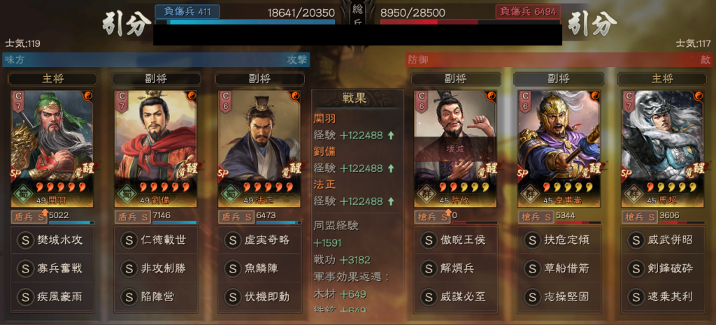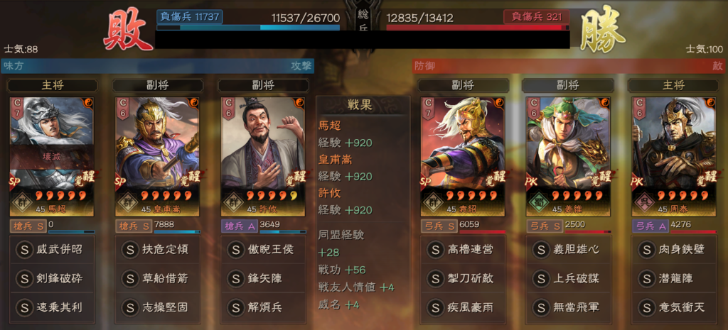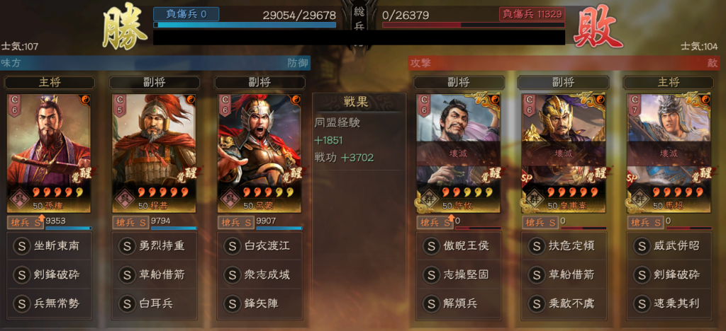 そのため摧鋒断刃が来期、加わることで、裸衣血戦・一騎当千の形から、裸衣血戦・摧鋒断刃の形になるため、ほとんどの場合で、相手の武力を上回ります。