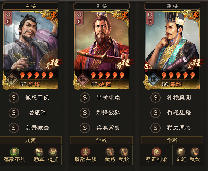 戦報を分析してみると、許攸を軸に、孫権・太史慈・賈詡・諸葛亮の4名の中から、どれか2名を選んで組めば、代替上手くいくのではないかと思います。