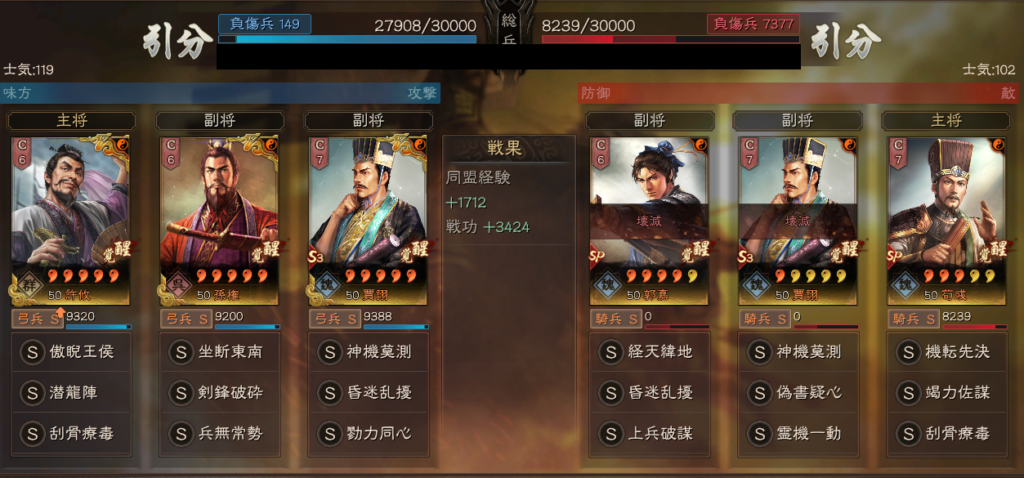 そのため、課金額が少なくとも、武将・戦法さえ揃えばある程度戦える編成です。