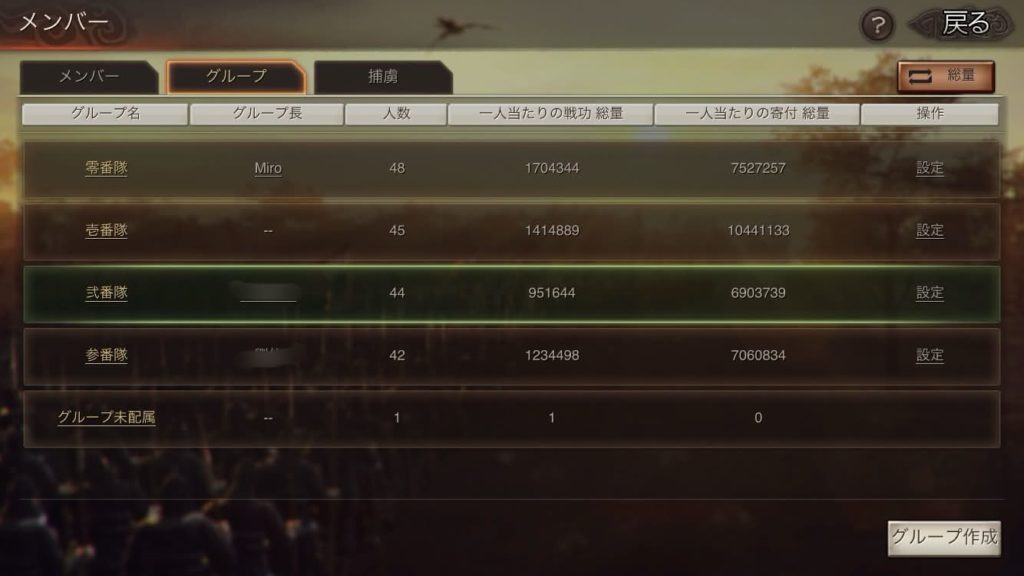 総勢200名のメンバーを4つのグループに、隊分けをしています。エース・遊撃隊の零番隊と壱番隊、弐番隊、参番隊の4つです。昔からのフレンド集団は同じ番隊に配置しており、隊によって隊チャットの内容も様々です。