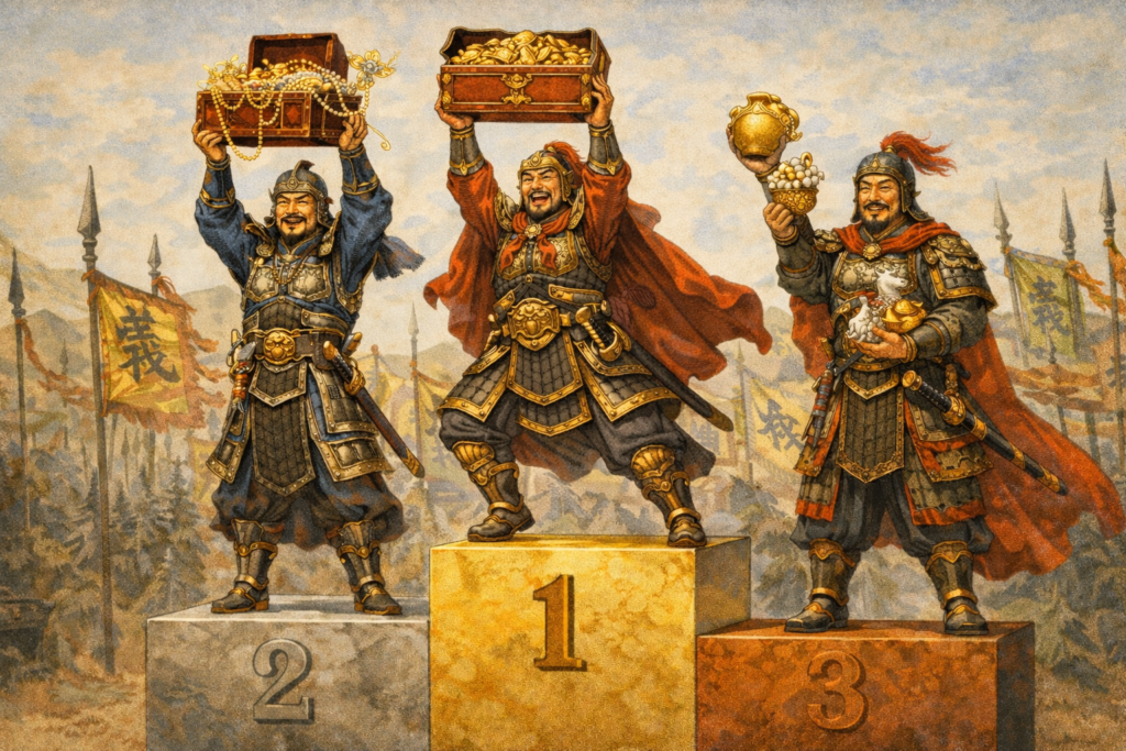 おもに、週間戦功を基準に金銖を配布します。各々の前週と今週の戦功比率で飛躍的に伸びた方へも金銖を配布したりもします。これは部隊強度、赤さに関係なくイン率や部隊の回転率を上げれば誰にでもチャンスがあるので取り入れています。