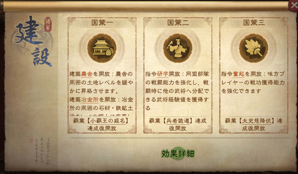 外交・建設・拡張・軍武の中から選び、国策を徐々に開放していきます。