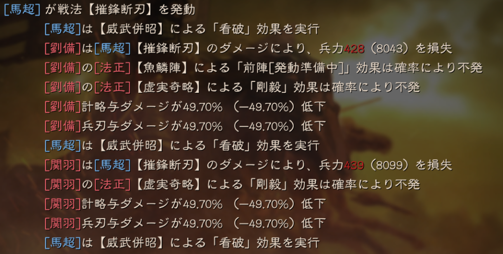 そのため、画像のようにSP法正の与ダメージ低下は入りますが、SP関羽には摧鋒断刃が入っても与ダメージ低下が入りません。