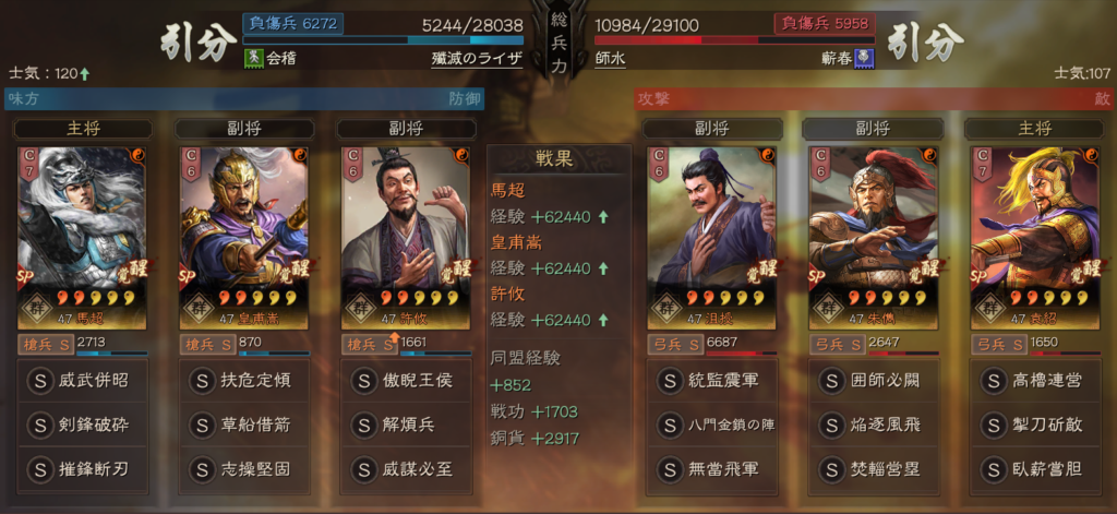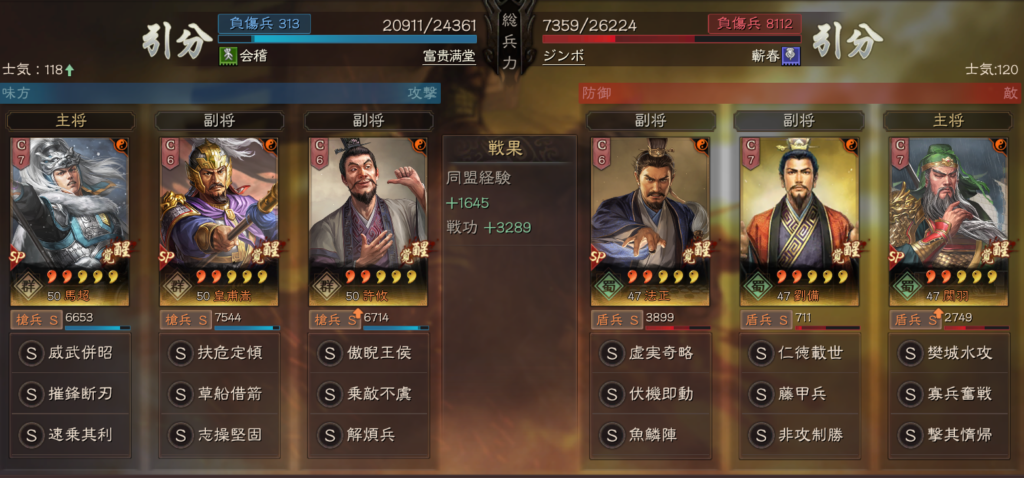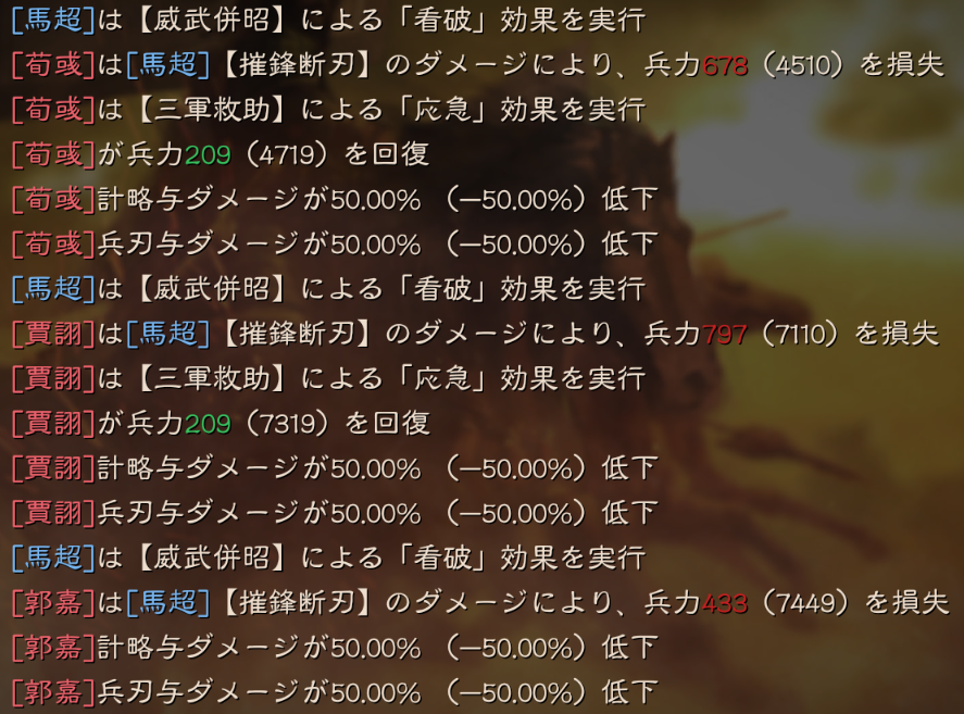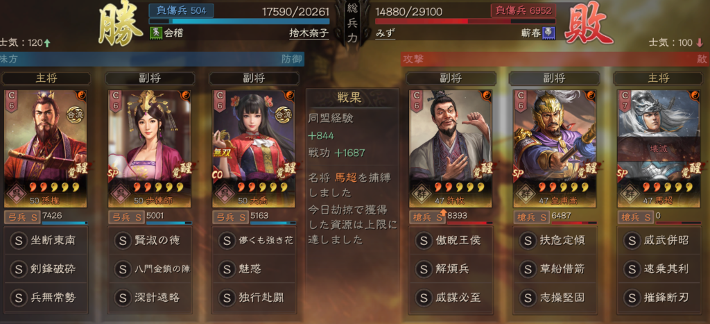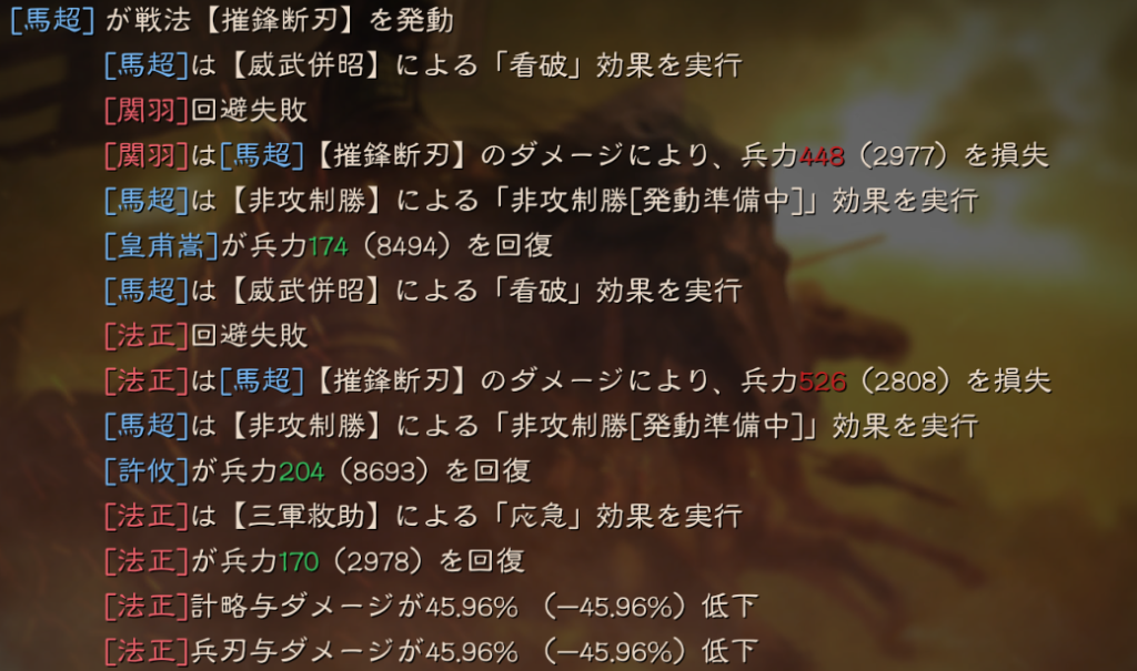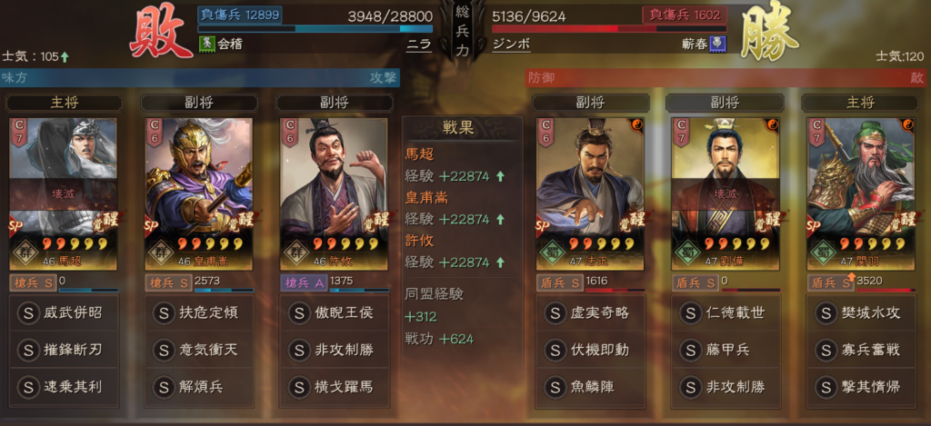 勝ちパターンとしては、寡兵奮戦で武力が上がる前に、SP馬超の摧鋒断刃が刺さった場合になります。