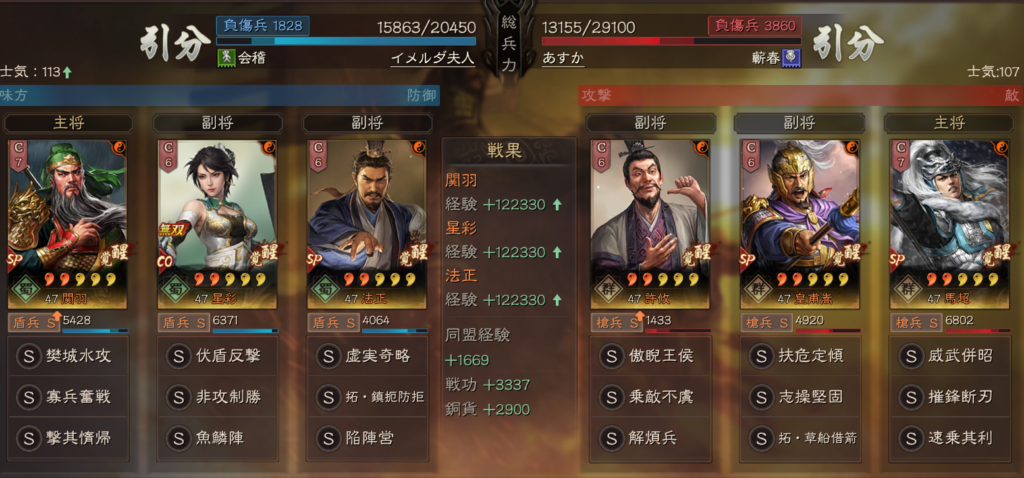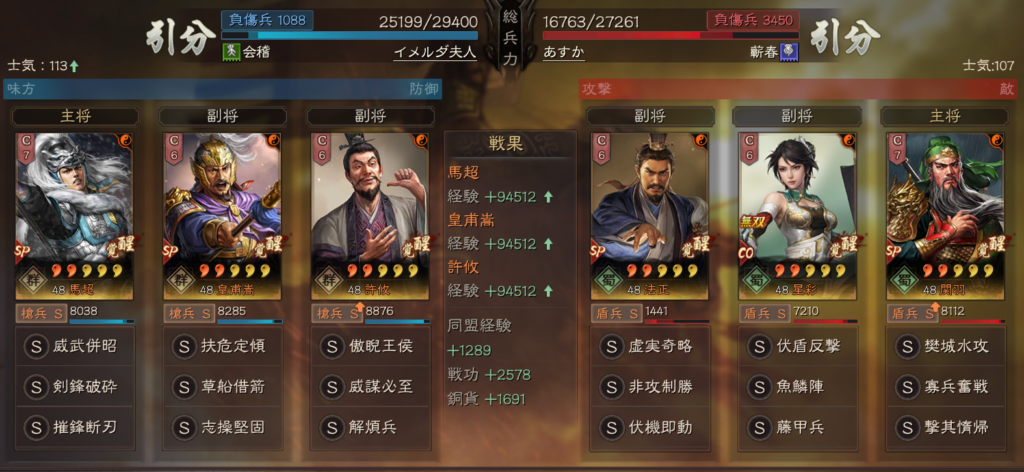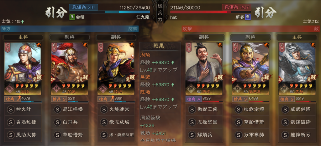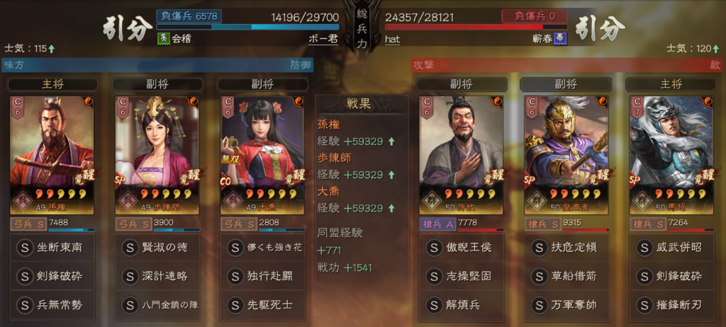 無双大喬の代わりに、SP呂蒙を使った形も、皇馬槍に強く、この手の編成が増えるのであれば、皇馬槍も単体ではなかなか良い戦果をあげにくいのかもしれません。