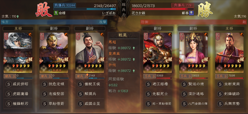 特に、虎踞鷹揚や速乗其利を代替戦法で用いた皇馬槍は、その結果がより顕著に出ます。